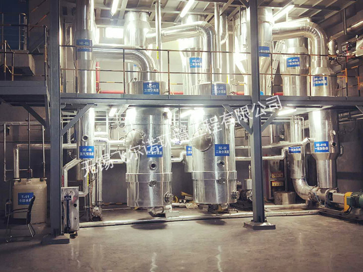 三效蒸發結晶器主要由相互串聯的三組蒸發器、冷凝器、鹽分離器和輔助設備等組成。三組蒸發器以串聯的形式運行,組成三效蒸發結晶器。整套蒸發系統采用連續進料、連續出料的生產方式。